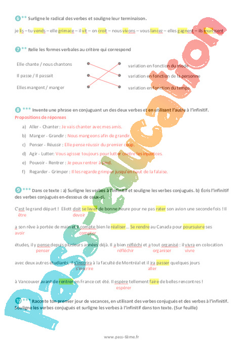 Correction exercices Le verbe à l’infinitif et le verbe conjugué 6ème pdf