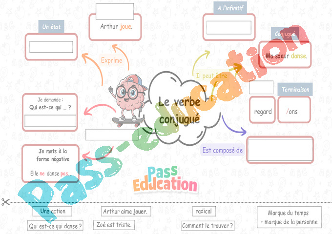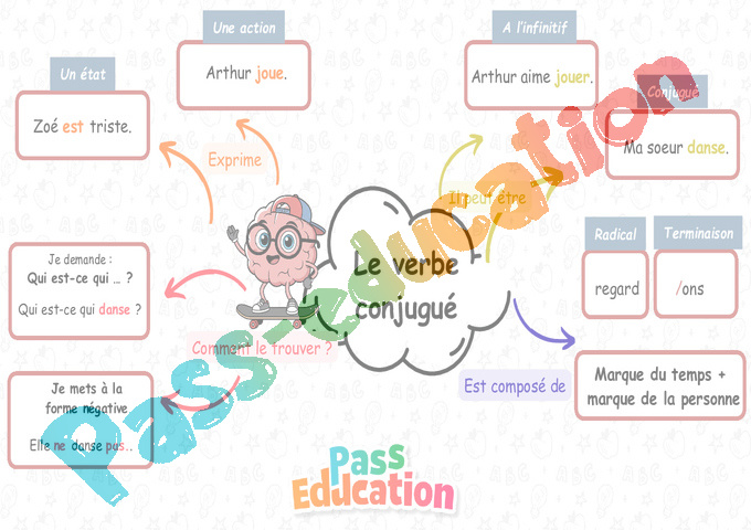 Cette carte mentale va permettre à l’aide de mots clés et d’associations d’idées d’avoir une vision synthétique sur la notion à mémoriser « Le verbe conjugué ».