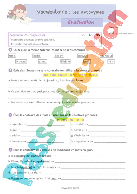 Evaluation : 5eme Harmos Les antonymes pdf