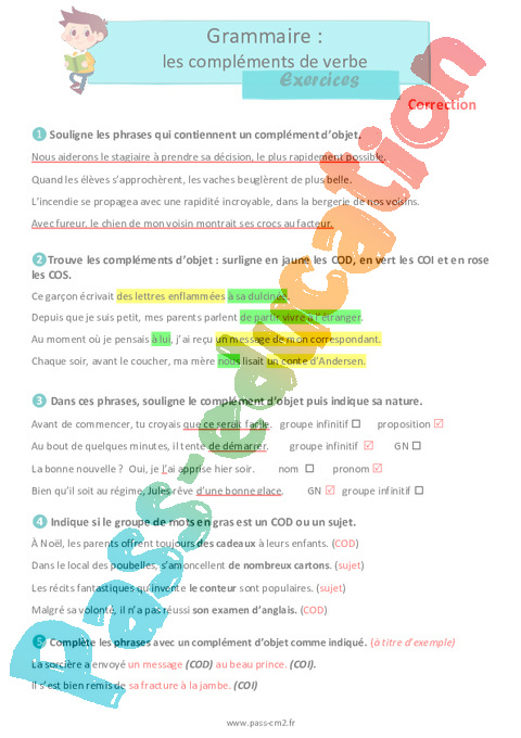 Correction Exercices Les compléments de verbe (COD, le COI): 7eme Harmos pdf
