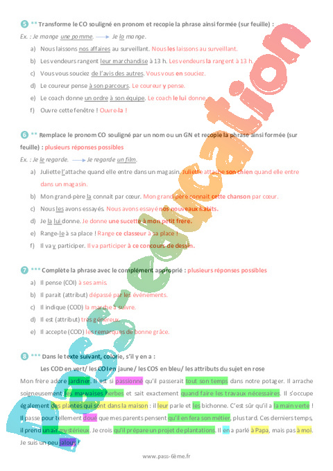 Correction Les compléments de verbe – Exercices de grammaire pour la 8eme Harmos pdf