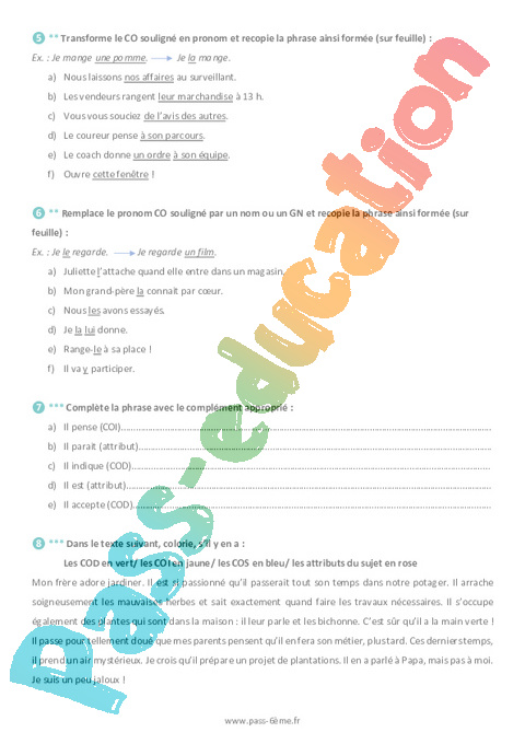 Exercices de grammaire avec la correction sur les compléments de verbe en 6ème.