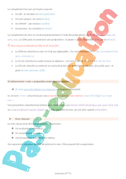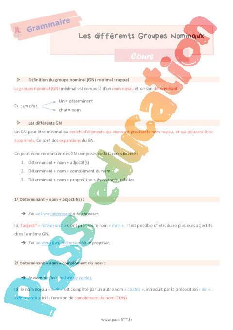 Cours de grammaire sur les différents groupes nominaux en 6ème.