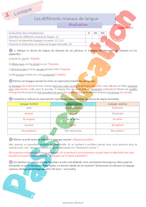 Correction Evaluation 6ème Les différents niveaux de langue pdf