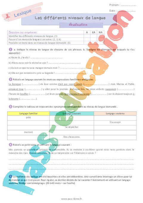Evaluation 6ème Les différents niveaux de langue pdf