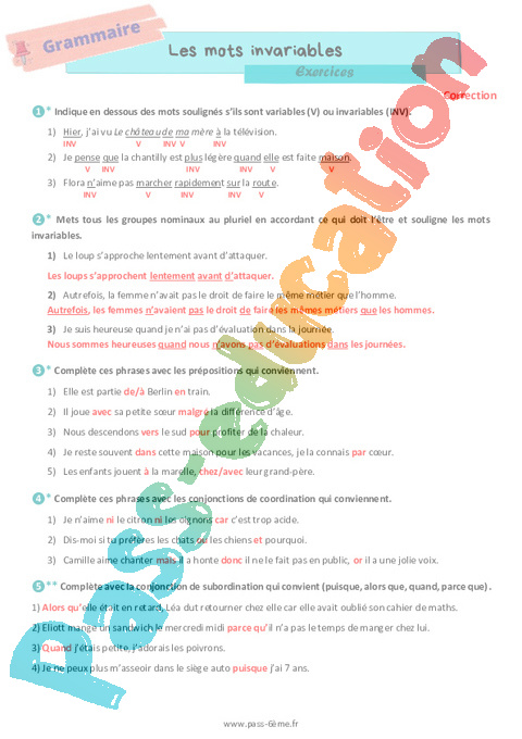 Exercices 6ème Les mots invariables pdf