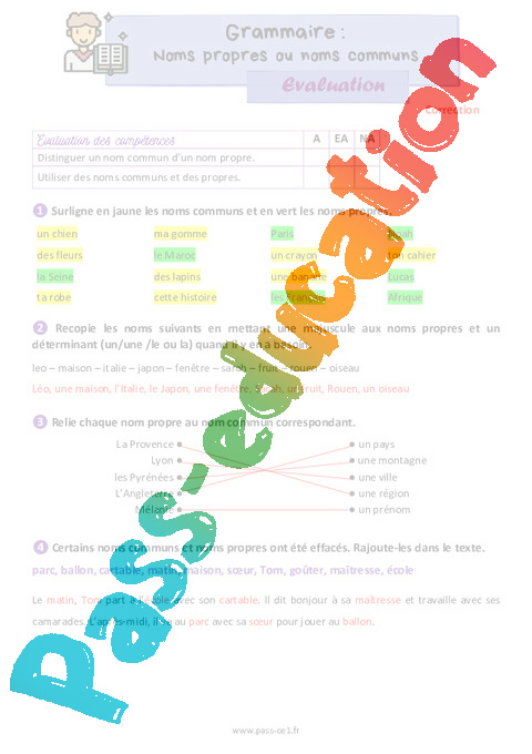 Correction Evaluation Les noms communs et noms propres : 4eme Harmos pdf
