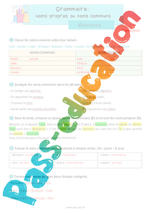 Correction Exercices Les noms communs et noms propres : 4eme Harmos pdf