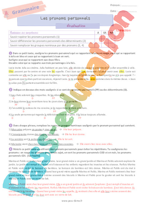 Évaluation de grammaire avec la correction sur les pronoms en 6ème.