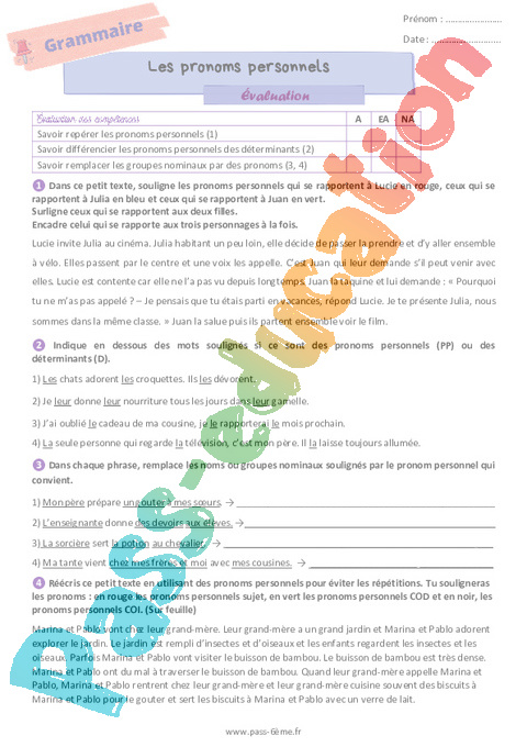 Evaluation Les pronoms 6ème pdf