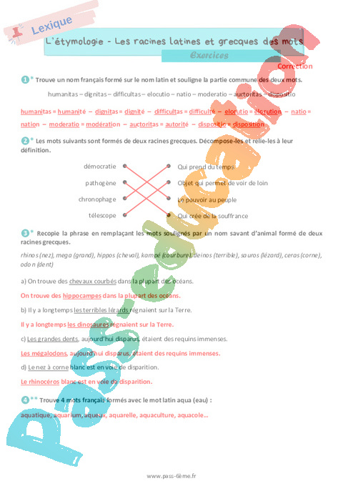 Correction Les racines latines et grecques en français – Exercices de vocabulaire 6ème rtf