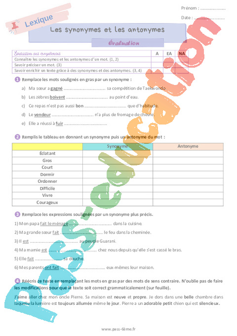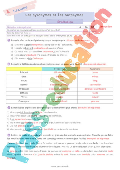 Évaluation de vocabulaire avec la correction sur les synonymes et les antonymes en 6ème.