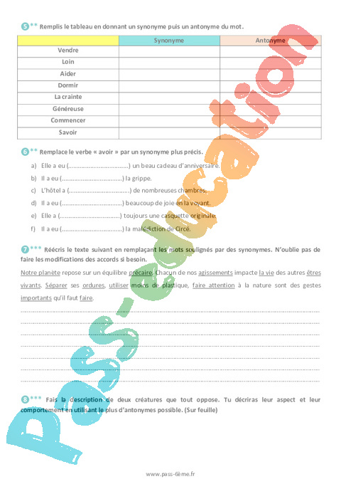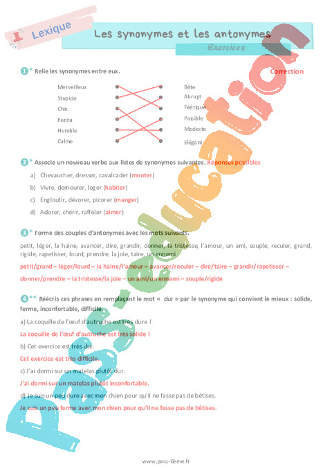Exercices de vocabulaire avec la correction sur les synonymes et les antonymes en 6ème.