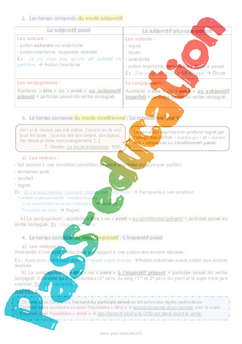 b) La conjugaison : « être » ou « avoir » à l’impératif présent + participe passé du verbe conjugué. Il n’existe qu’à 3 personnes (2e pers. du sing / 1re et 2e pers. du plur) et le sujet n’est pas exprimé.