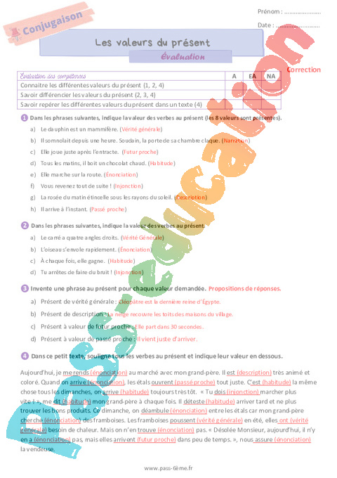 Évaluation de conjugaison pour la 8eme Harmos sur les valeurs du présent.