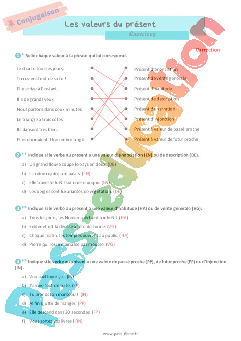 Exercices Les valeurs du présent 6ème pdf