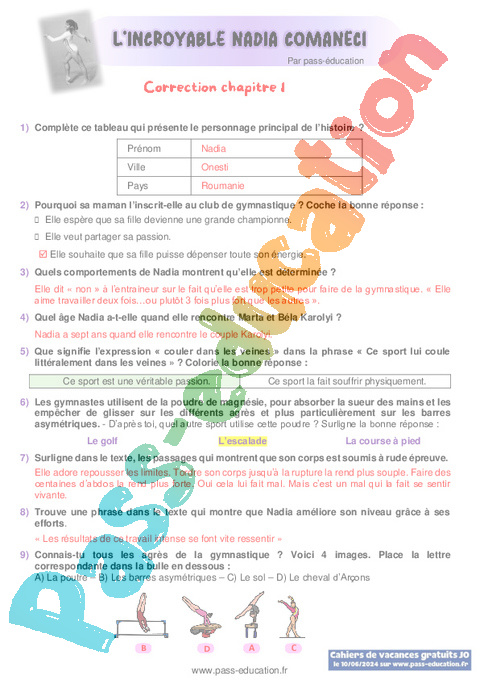 Correction Questionnaire : 6eme, 7eme, 8eme Harmos Chapitre 1 L’incroyable Nadia Comaneci pdf