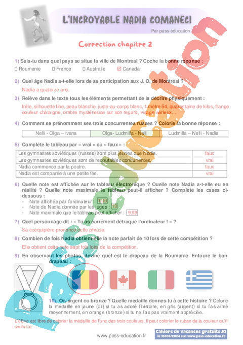 Correction Questionnaire : 6eme, 7eme, 8eme Harmos Chapitre 2 L’incroyable Nadia Comaneci rtf