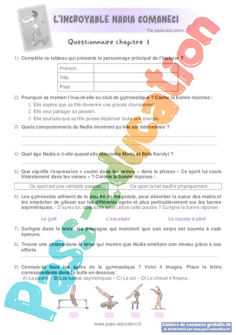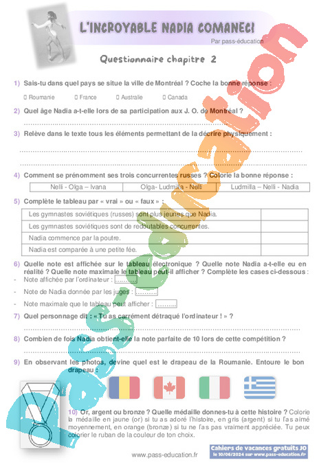 Questionnaire : 6eme, 7eme, 8eme Harmos Chapitre 1 L’incroyable Nadia Comaneci rtf