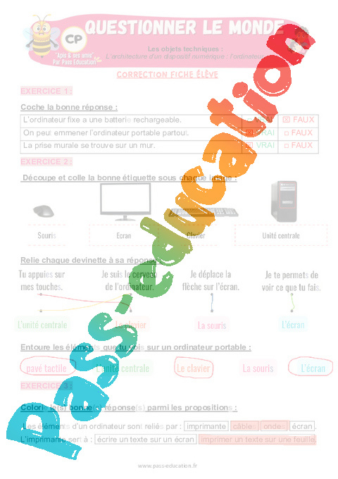4.1 Correction Fiche Elève : 3eme Harmos Architecture d’un dispositif numérique – l’ordinateur pdf