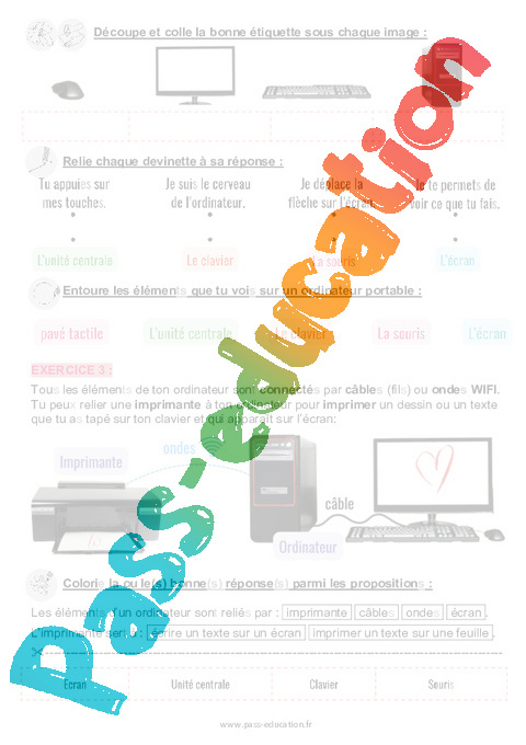 Tous les éléments de ton ordinateur sont connectés par câbles (fils) ou ondes WIFI. Tu peux relier une imprimante à ton ordinateur pour imprimer un dessin ou un texte que tu as tapé sur ton clavier et qui apparaît sur l’écran: