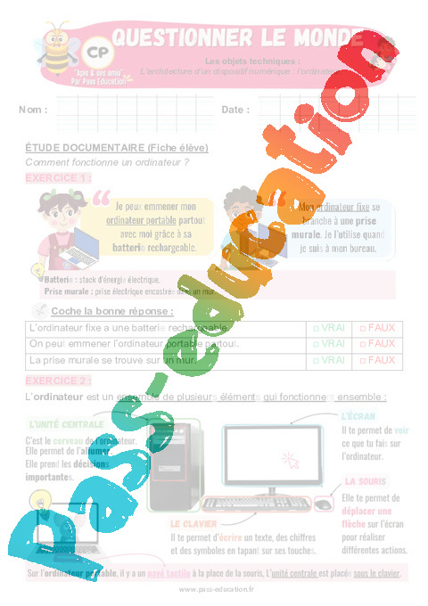 Exercices – L’ordinateur – Architecture d’un dispositif numérique en 3eme Harmos – Apis & ses amis : Questionner le monde.