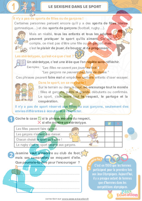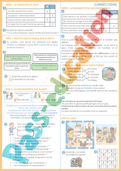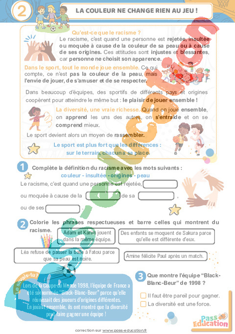 Fichier d’activités à imprimer sur la lutte contre la discrimination et le racisme dans le sport (EMC) pour la 4eme, 5eme Harmos .
