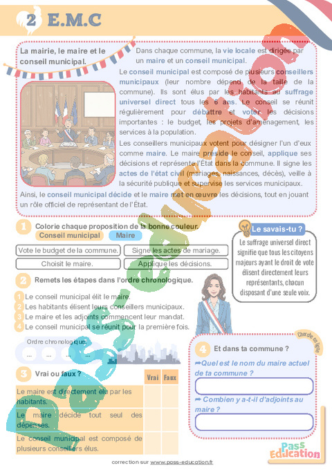 ➦ La mairie représente l’État à l’échelle locale. Le maire, ses adjoints et le conseil municipal s’occupent de la vie quotidienne des habitants : écoles, voirie, état civil, urbanisme, culture, solidarité…