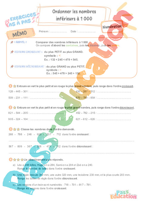 Ordonner les nombres inférieurs à 1 000 : 5eme Harmos – Exercices Pas à Pas rtf