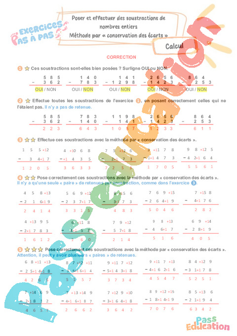 Exercices Pas à Pas avec mémo / leçon de numération pour travailler la compétence : Poser et effectuer des soustractions de nombres entiers – Méthode par « conservation des écarts » au : 5eme Harmos .