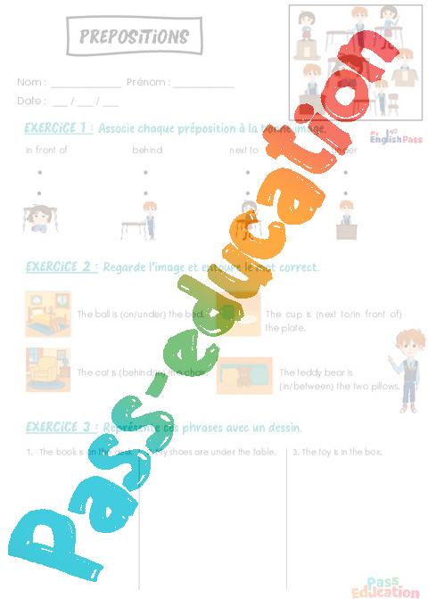 EXERCICE 1 : Associe chaque préposition à la bonne image.