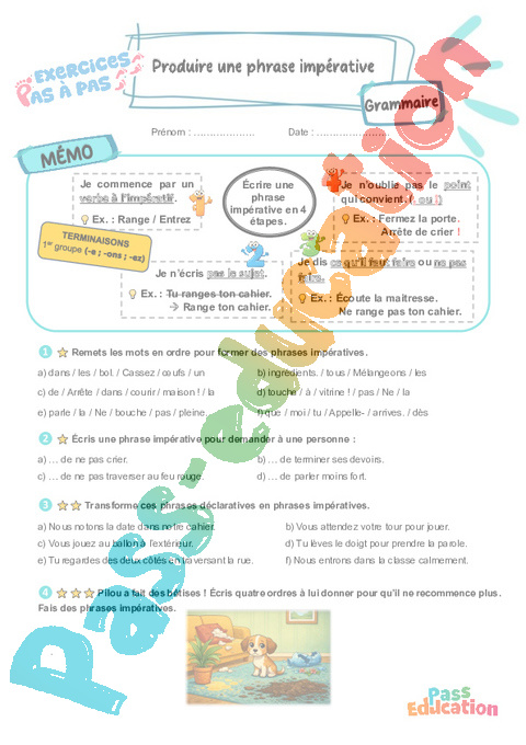 Exercices Pas à Pas avec mémo / leçon de grammaire pour travailler la compétence : produire une phrase impérative au : 5eme Harmos .