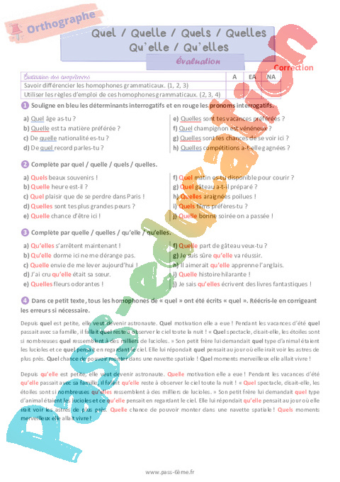 Correction Evaluation Quel Quelle Quels Quelles Qu’elle (Homophones grammaticaux) 6ème pdf