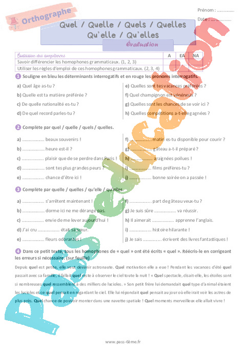Evaluation Quel Quelle Quels Quelles Qu’elle (Homophones grammaticaux) 6ème pdf