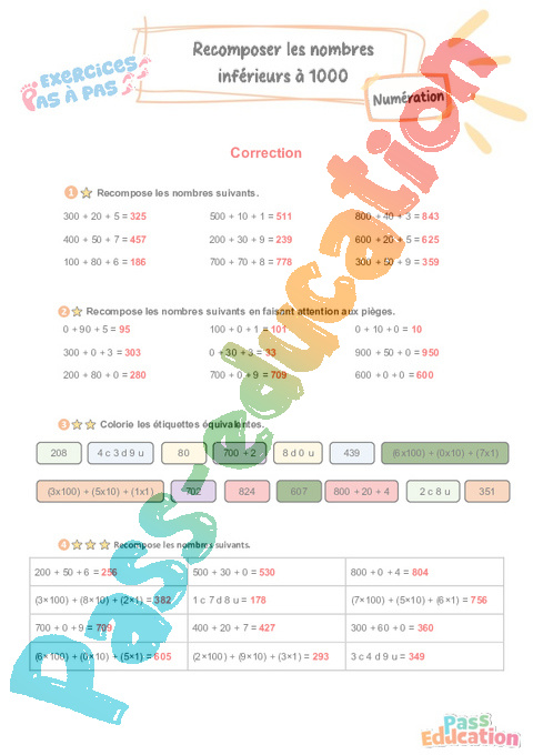 Correction Recomposer les nombres inférieurs à 1000 : 5eme Harmos – Exercices Pas à Pas rtf