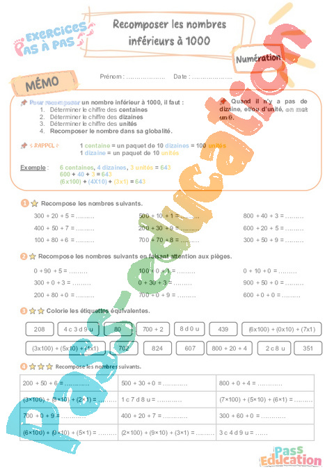 Recomposer les nombres inférieurs à 1000 : 5eme Harmos – Exercices Pas à Pas rtf