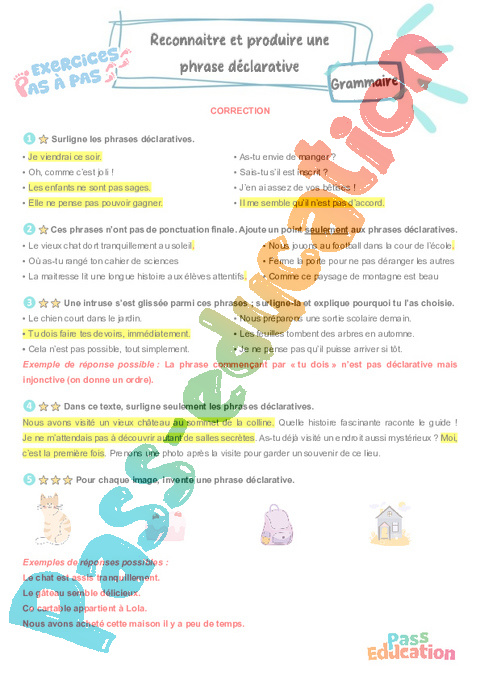 Correction Reconnaitre et produire une phrase déclarative : 7eme Harmos – Exercices Pas à Pas pdf