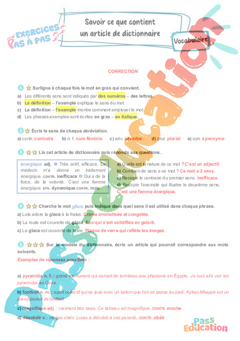 Correction Savoir ce que contient un article de dictionnaire : 7eme Harmos – Exercices Pas à Pas pdf