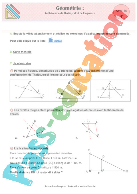 1 a Géométrie le théorème de Thalès calcul de longeurs Semaine 10 IEF 4e pdf