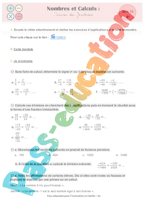 1 a Nombres et calculs- Diviser des fractions Semaine 16 IEF : 10eme Harmos pdf