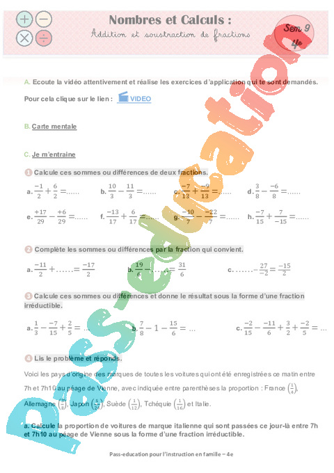 1 a Nombres et calculs- Addition et soustraction de fractions Semaine 9 IEF : 10eme Harmos pdf