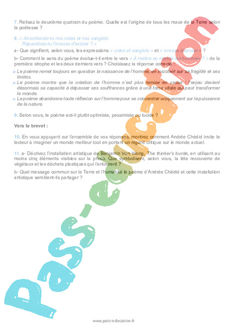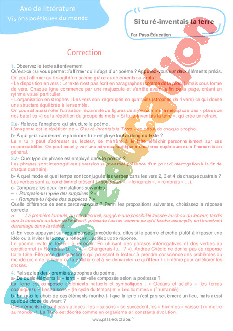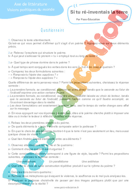 Correction Questionnaire Si tu ré-inventais la terre (Andrée Chédid) : 11eme Harmos pdf