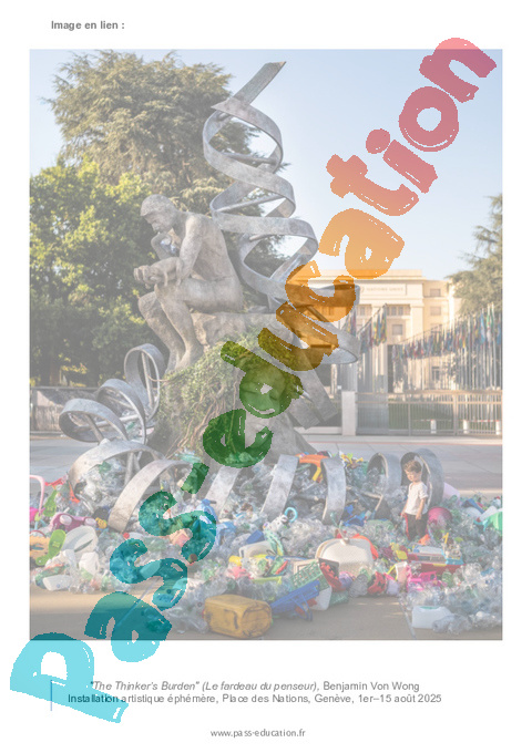 11. a- Décrivez l’installation artistique de Benjamin Von Wong, The thinker’s burde, en utilisant au moins cinq éléments visibles sur la photo. Que symbolisent, selon vous, la tête recouverte de végétaux et les déchets plastiques qui l’entourent ?