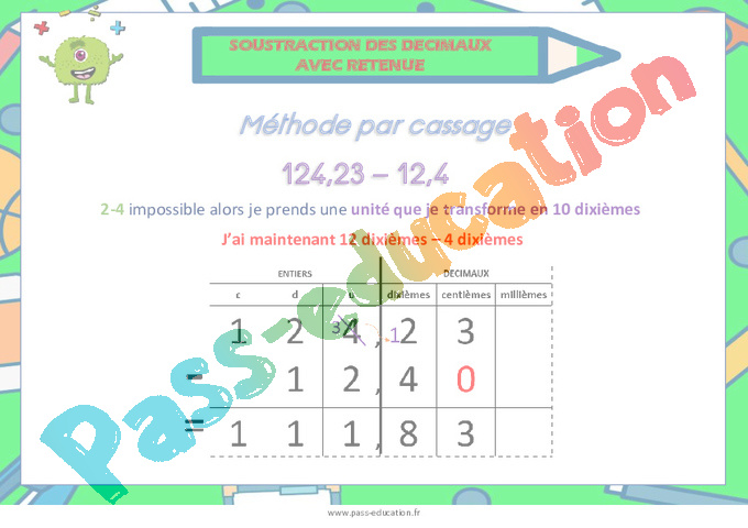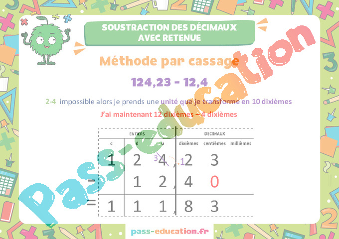 Soustraction des décimaux avec retenue – Affiche : 6ème, 7ème Harmos – PDF à imprimer