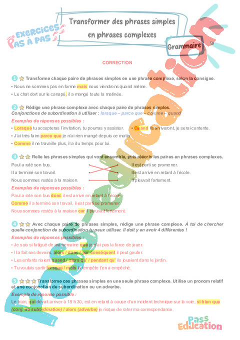 Correction Transformer des phrases simples en phrases complexes : 7eme Harmos – Exercices Pas à Pas rtf