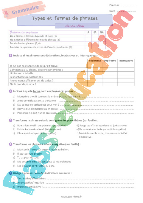 Evaluation Types et formes de phrases 6ème pdf