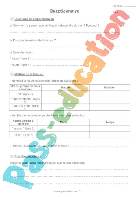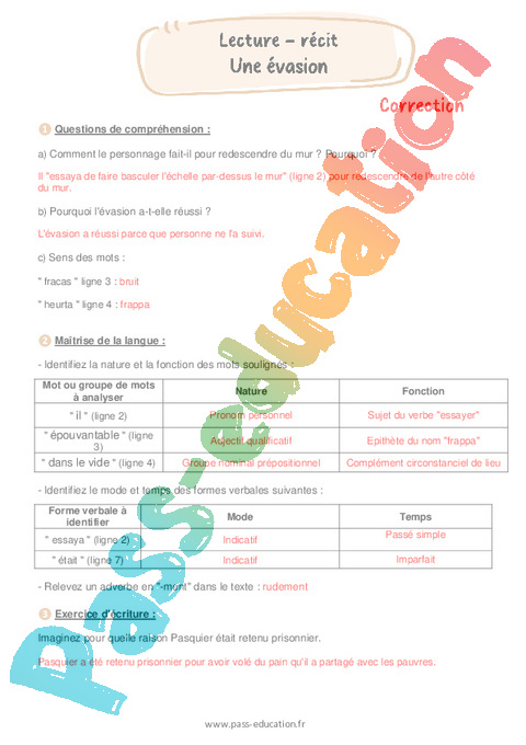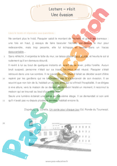 Récit Lecture + Questionnaire Une évasion : 8eme Harmos pdf